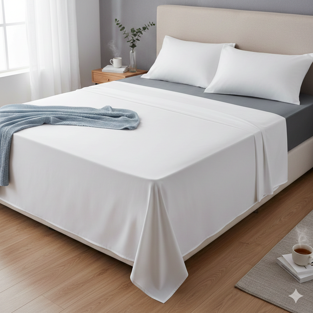 1. Baza: Gładka pościel w neutralnym kolorze (np. beżowy len).